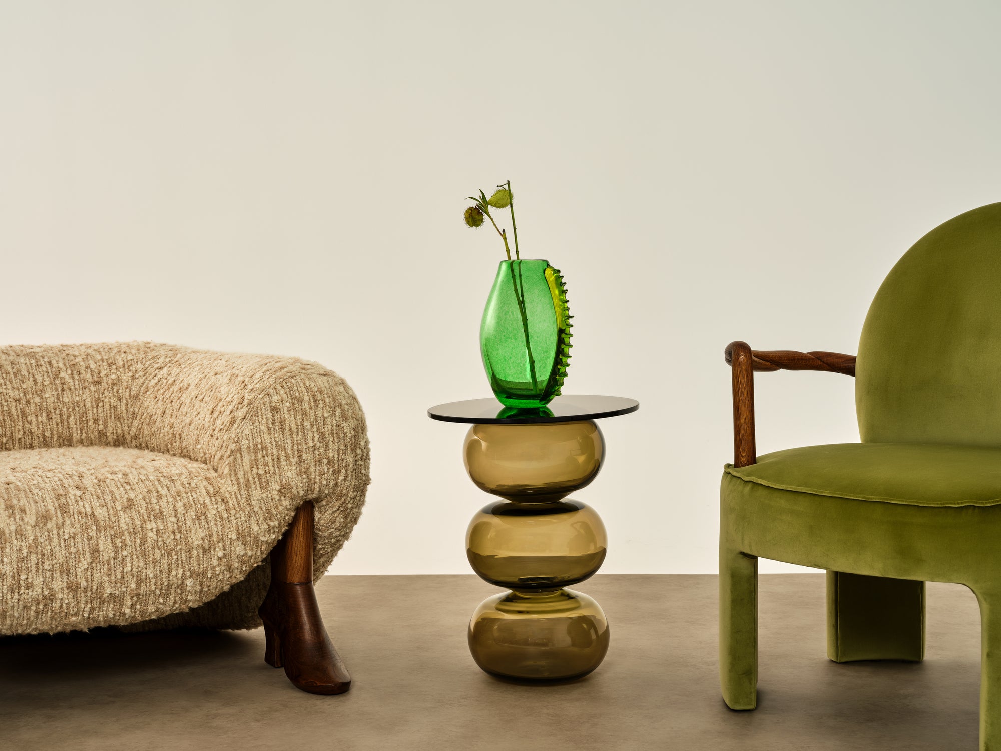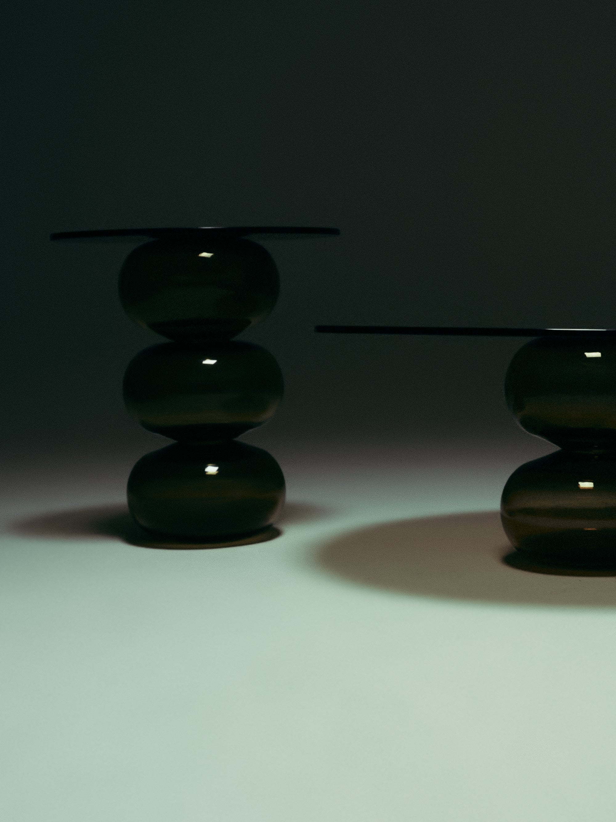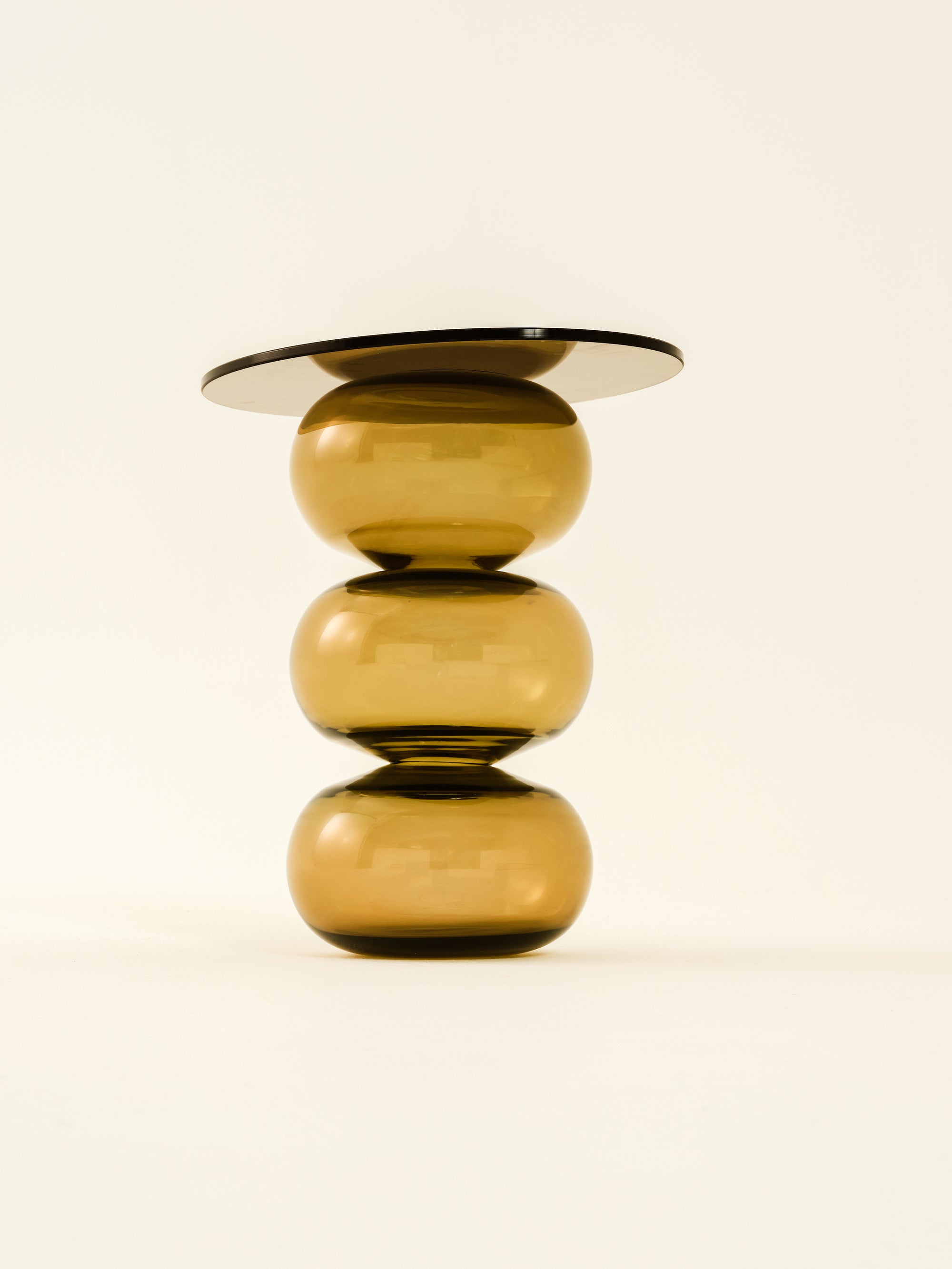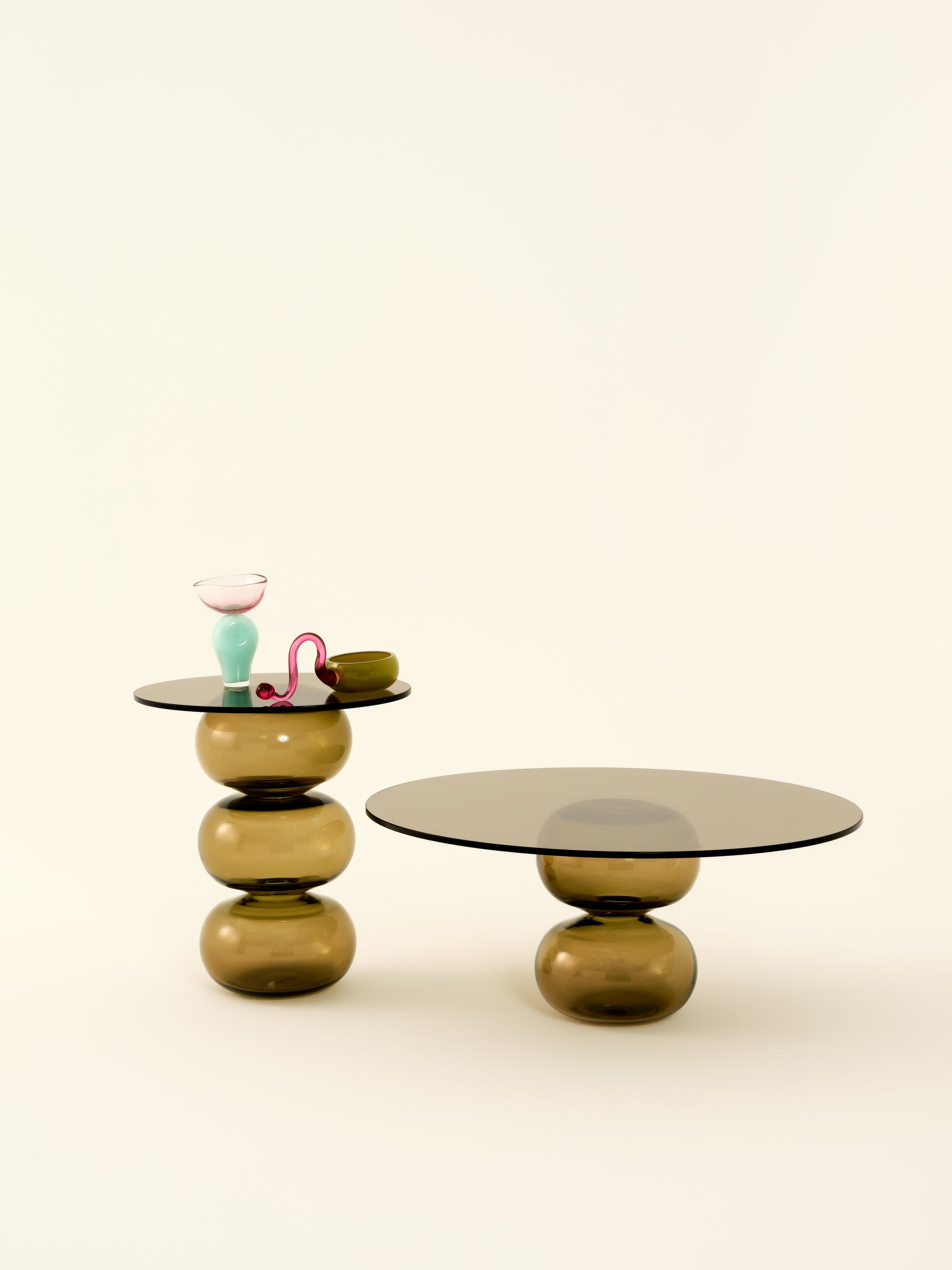 The Donut Coffee Table and Side Tables are thoughtfully designed with round bases crafted from mouth-blown glass, each showcasing subtle, unique variations that reflect the artistry of hand-blown techniques. The tops are made from tempered glass, selected for its high durability and impact resistance, providing a sturdy and secure surface. The transparency of the tempered glass and the sculptural bases creates an open, minimalist look, making these tables adaptable to a range of interior styles. This design combines aesthetic refinement with practical strength, celebrating both the beauty of handmade glass and the functionality required for everyday use.