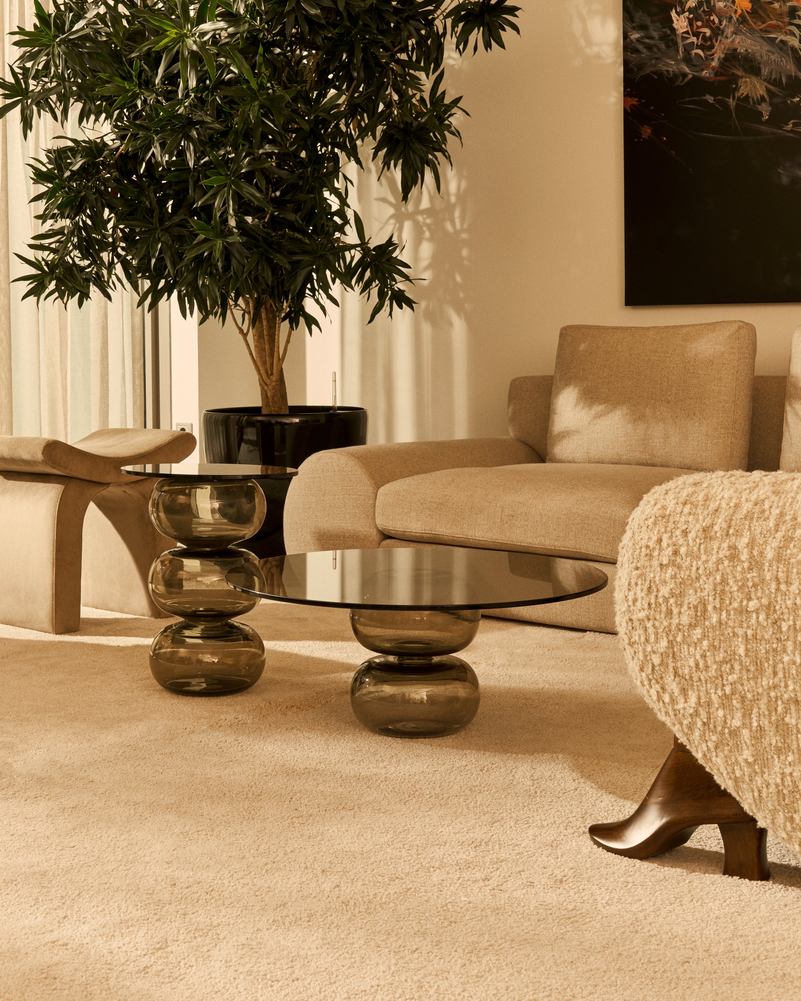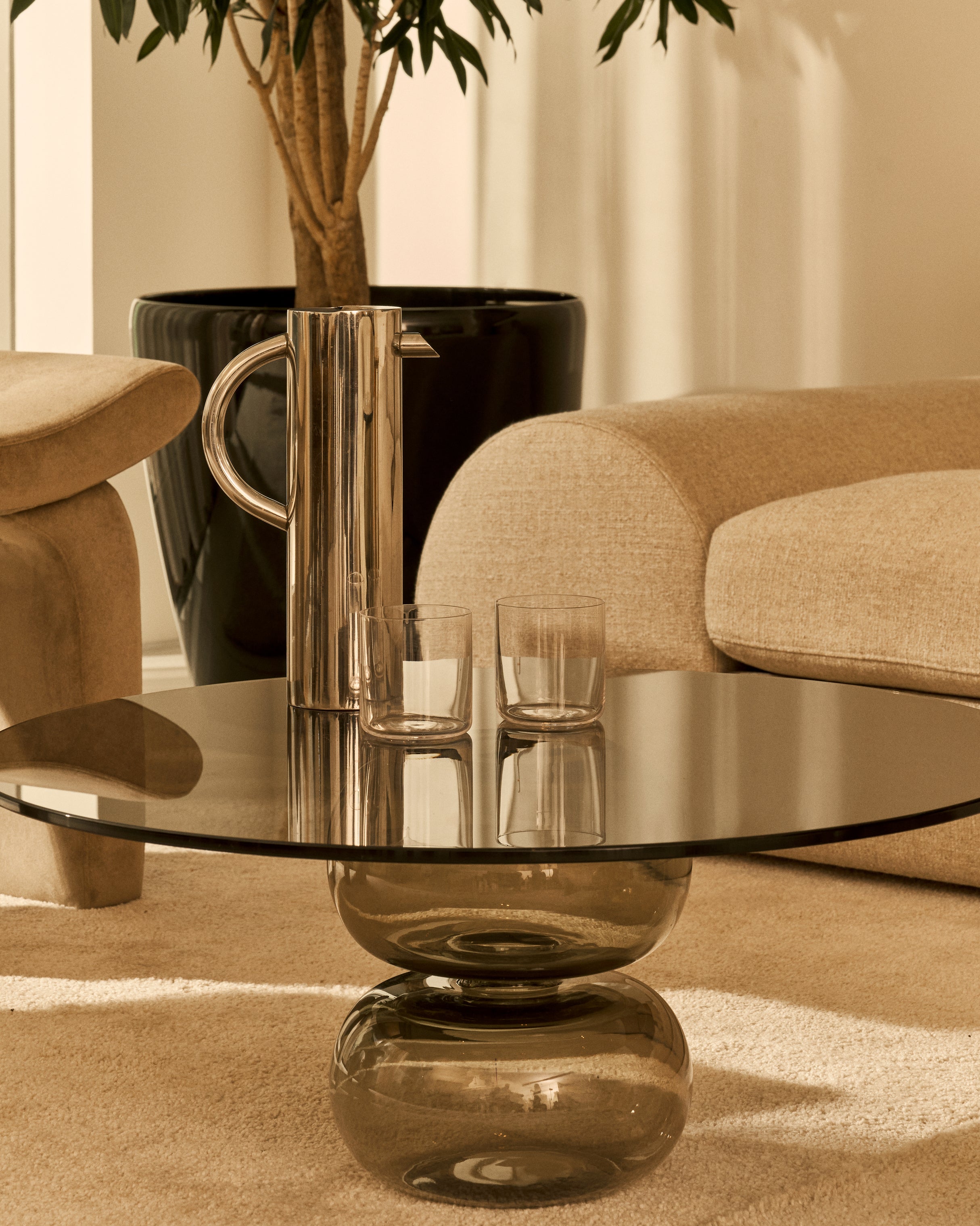The transparency of tempered glass combined with sculptural bases creates a fresh, minimal aesthetic that blends easily with a variety of interior styles. This design celebrates elegance and durability, combining the aesthetic sophistication of hand-blown glass with the functionality required for everyday use.